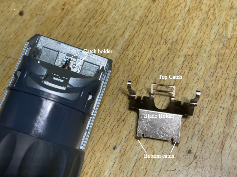 The blade holder which is in the form of metal clips must first be removed. To remove the clips, one must use a small screwdriver to free the top catch from the 2 catch holders as shown in the attached picture.